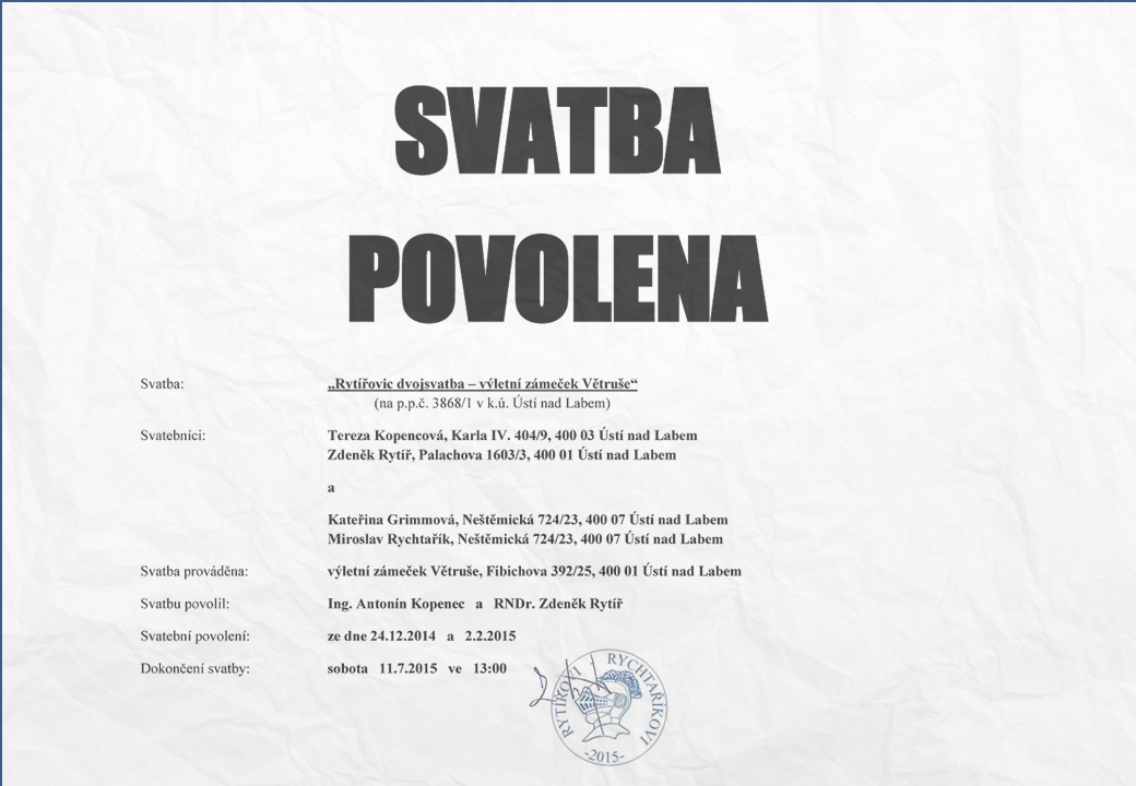 Předem upozorňujeme, že se nejedná o jen tak ledajakou svatbu! A sice proto, že jde o "Rytířovic sourozeneckou dvojsvatbu". Pokud se na nás přijdete v náš velký den podívat, nenechte se zaskočit dvojitou várkou nevěst a ženichů.